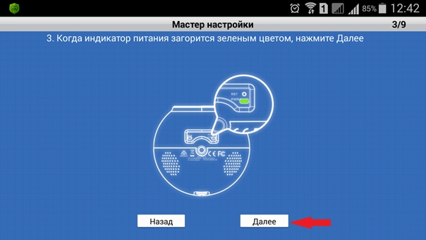 Шаг 7: Убедитесь, что индикатор питания устройства горит зеленым светом. Коснитесь значка Далее.