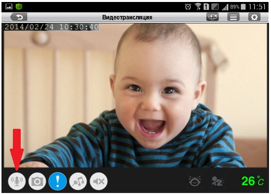 Шаг 3: Нажмите кнопку микрофона слева в нижней части окна Видеотрансляция. Теперь можно говорить в микрофон смартфона или планшета, а звук будет воспроизводиться в динамиках камеры.