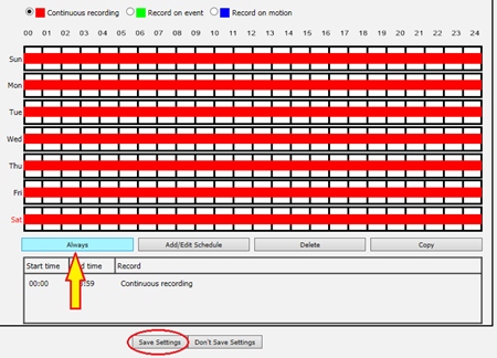 1) Нажмите кнопку Always (Всегда). После этого будет активирована постоянная запись для всех дней недели с выбранной камеры, о чем свидетельствует гистограмма красного цвета. Нажмите кнопку Save Settings для сохранения настроек.