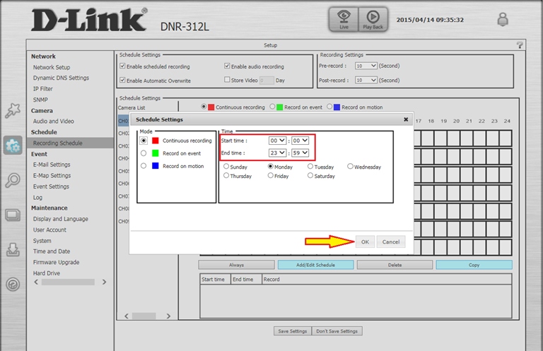 2) Нажмите кнопку Add/Edit Schedule (Добавить/Редактировать расписание). В появившемся окне в списке Mode (Режим) выберите Continuous recording (Постоянная запись). Далее выберите день недели и задайте время начала записи (Start Time) и время окончания записи (End Time). Нажмите OK и затем Save Settings (Сохранить настройки).