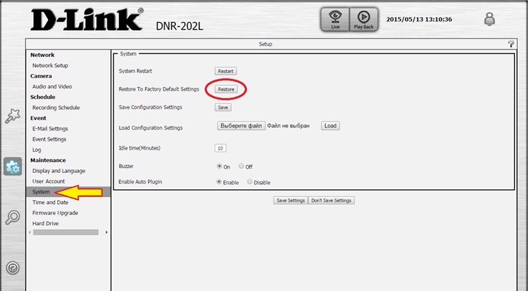 Шаг 6. После обновления рекомендуется сбросить видеорегистратор к заводским настройкам. Для этого в разделе System (Система) нажмите кнопку Restore (Восстановление)