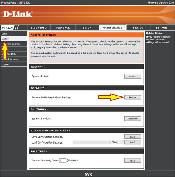 Шаг 6. После обновления рекомендуется сбросить видеорегистратор к заводским настройкам. Для этого в разделе System (Система) нажмите кнопку Restore (Восстановление).