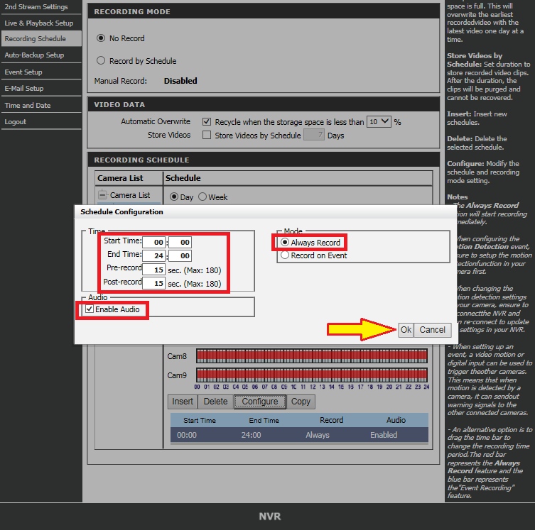 Нажмите кнопку Configure (Сконфигурировать) и в появившемся окне в списке Mode (Режим) выберите Always Record (Постоянная запись). Далее задайте время начала записи (Start Time) и время окончания записи (End Time). Для записи видео со звуком, поставьте флажок в поле Enable Audio (Включить аудио). Нажмите OK.