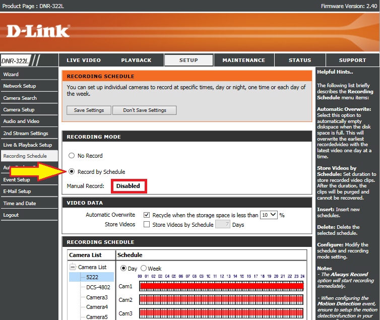 В окне Recording Mode (Режим записи) выберите Record by Schedule (Запись по расписанию). Так же убедитесь, что ручная запись отключена. Об этом свидетельствует надпись Disabled (Отключено) в строке Manual Record (Ручная запись).