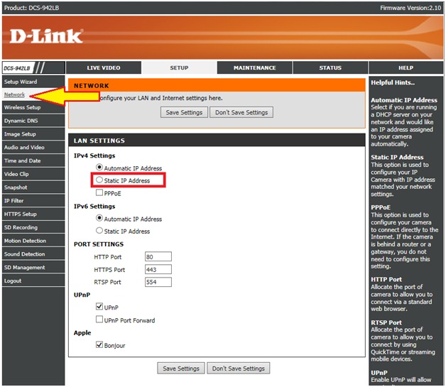 Шаг 4: В меню слева выберите Network (Сеть) и в разделе IPv4 Setting установите переключатель в положение Static IP Address (Статический IP-адрес).