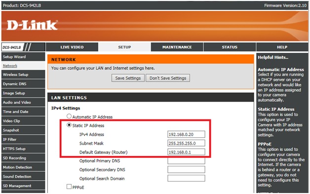 Шаг 5: Введите требуемый IP-адрес для камеры в поле IPv4 Address, маску подсети в поле Subnet Mask и основной шлюз в поле Default Gateway.