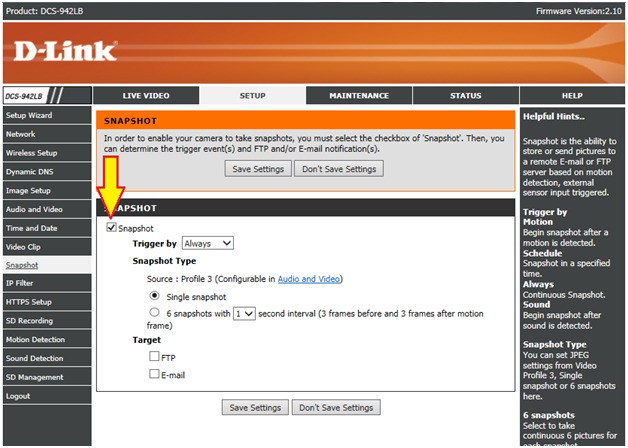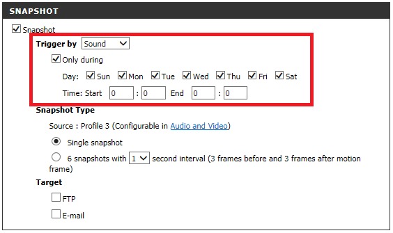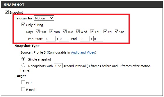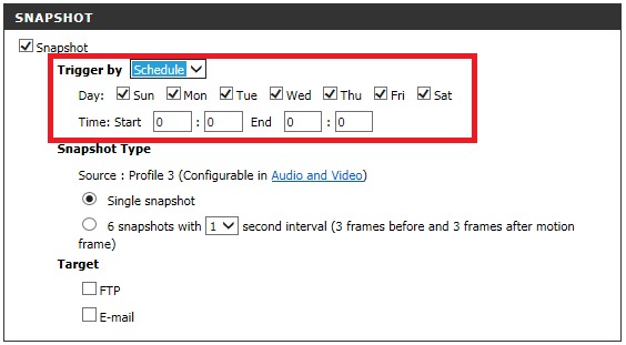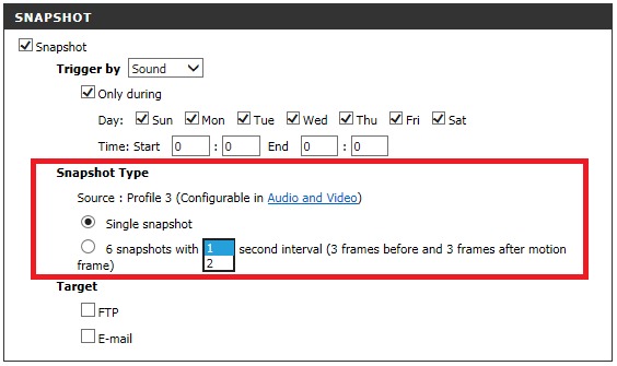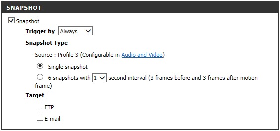 Шаг 5: Поставьте флажок Snapshot (Снимок) для того, чтобы включить отправку снимков на FTP-сервер и электронную почту.