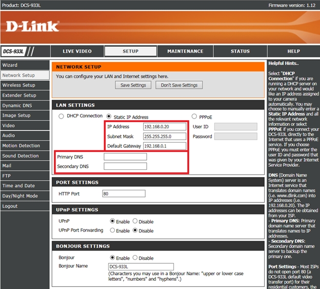 Шаг 4: В меню слева выберите Network Setup (Настройка сети) и в разделе LAN Settings установите переключатель в положение Static IP Address (Статический IP-адрес).