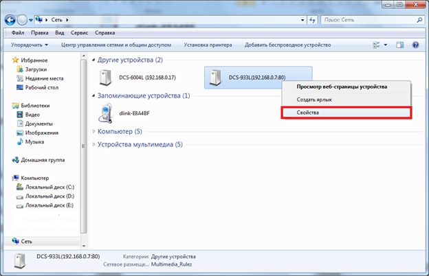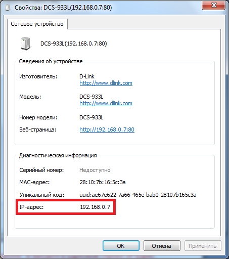 Шаг 3: В разделе Другие устройства найдите DCS-933L. В названии должен быть отображен IP-адрес камеры. Если адрес не отображается, щелкните правой кнопкой мыши по значку камеры и в открывшемся меню выберите Свойства.