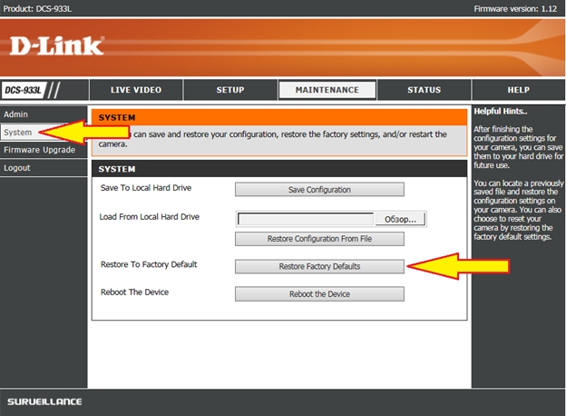 Шаг 6: После обновления прошивки камеру рекомендуется сбросить к заводским настройкам. Для этого в меню слева выберите System (Система) и нажмите кнопку Restore Factory Defaults (Восстановить заводские настройки).