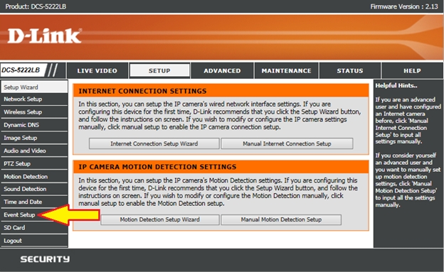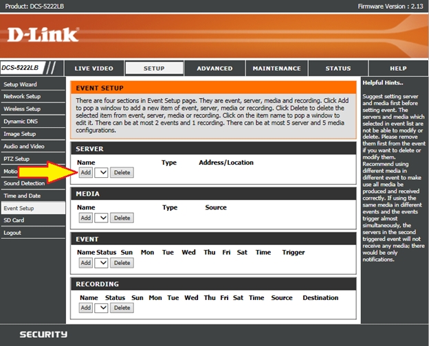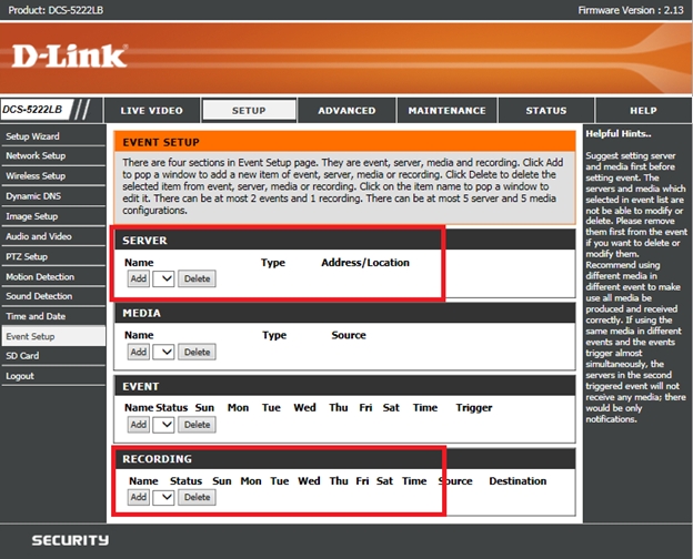 Шаг 10: Далее нажимаем кнопку Save settings для сохранения текущих настроек. После завершения всех настроек раздел Event Setup будет выглядеть, как показано ниже и при этом будет осуществляться непрерывная запись видео на заданный сервер.