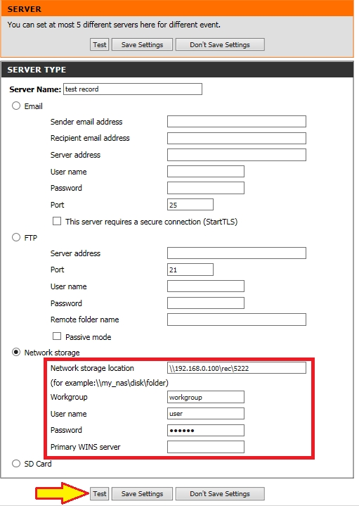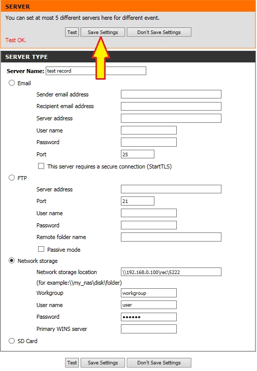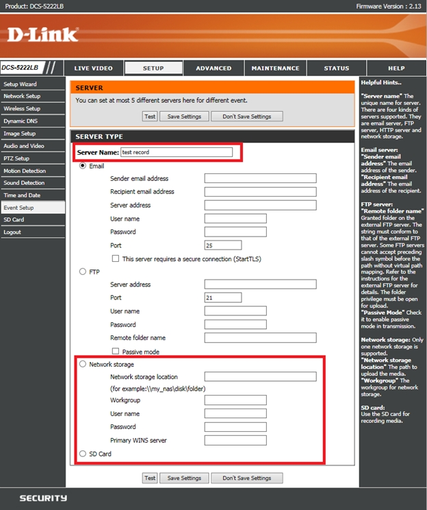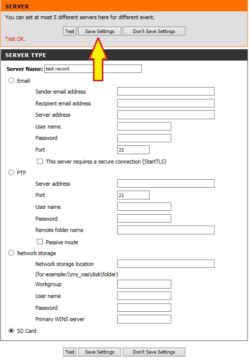 Шаг 7: Введите произвольное имя сервера в поле Server Name и выберите сервер для записи видео: Network storage (Сетевое хранилище) или SD Card (SD карта).