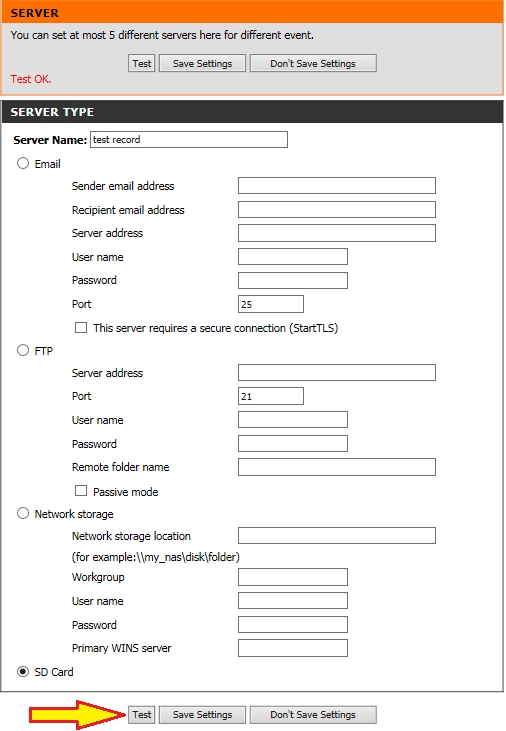 Для добавления в качестве сервера SD карты, установленной в камере, ставим точку напротив поля SD Card. Нажмите кнопку Test, чтобы проверить доступность сервера.