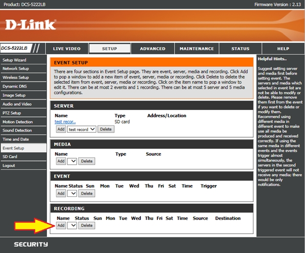 Шаг 8: После того, как сервер был добавлен, нажмите кнопку Add (Добавить) в разделе RECORDING.
