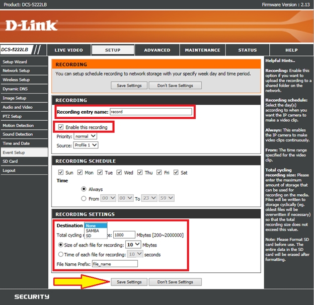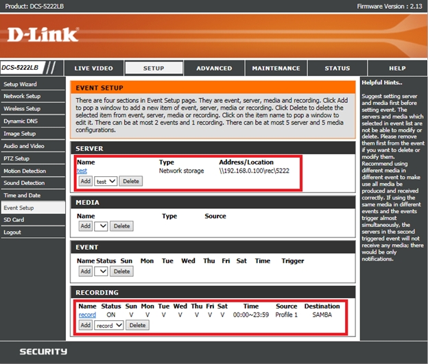 Вопрос: Как настроить непрерывную запись видео на сетевое хранилище (samba сервер) или SD карту с камеры DCS-5222LB?