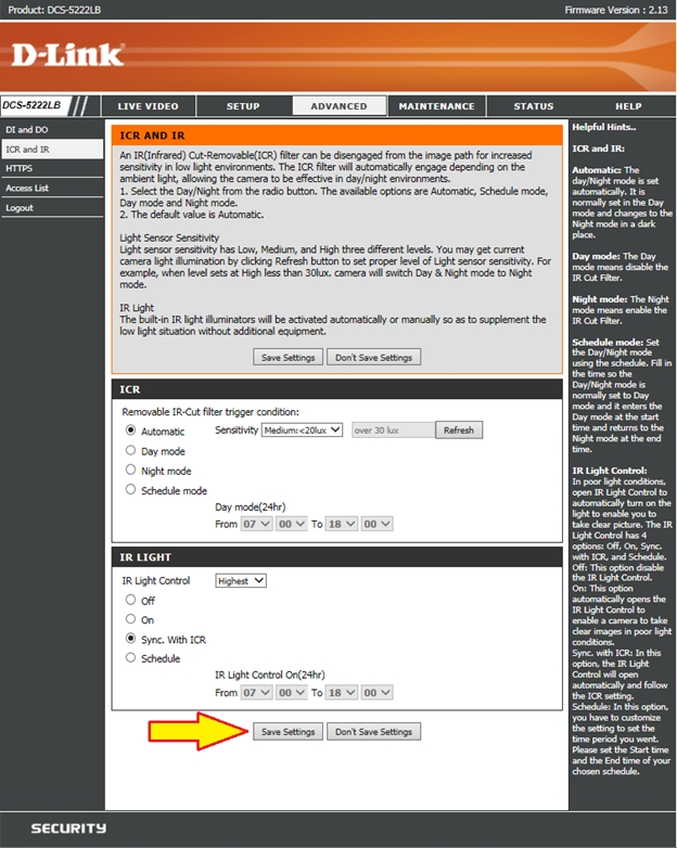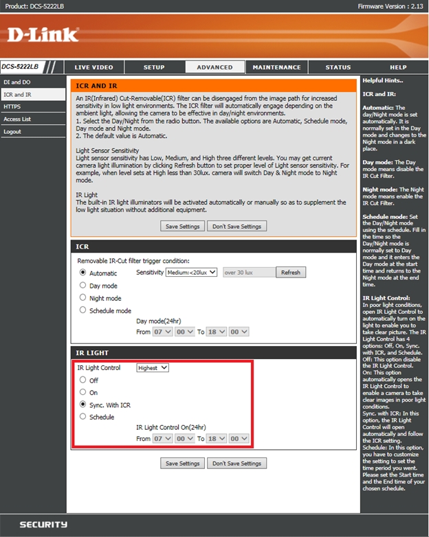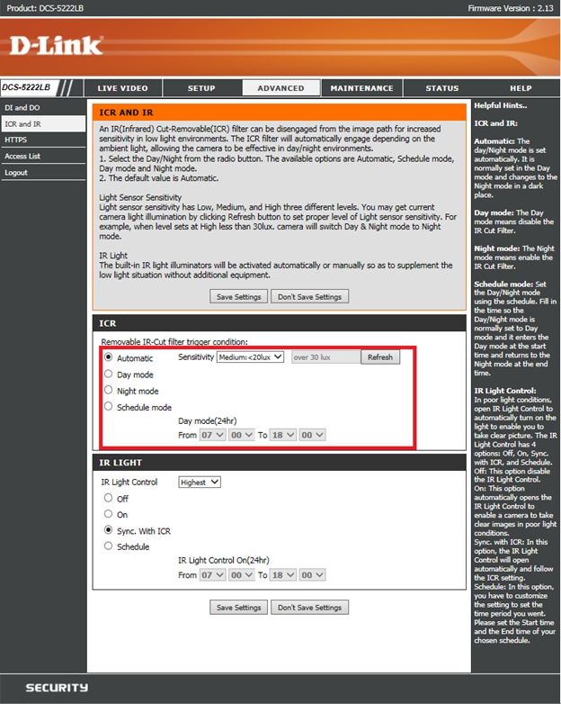 Вопрос: Как настроить режим День/Ночь на камере DCS-5222LB?