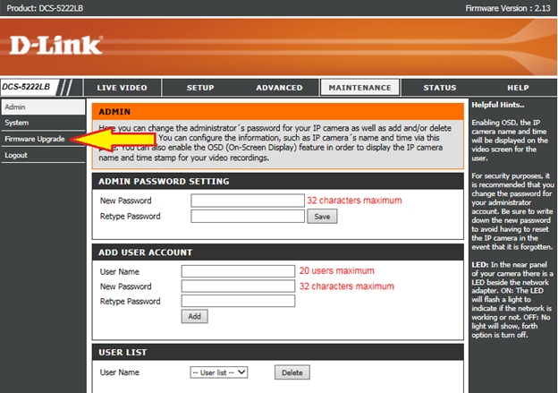 Шаг 4: Выберите слева в меню Firmware Upgrade (Обновление прошивки).