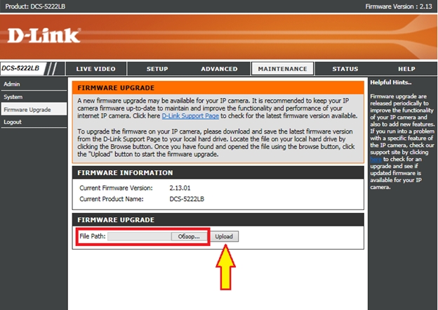 Шаг 5: Нажмите кнопку Обзор и в открывшемся окне выберите файл с прошивкой. Далее нажмите кнопку Upload (Загрузить).