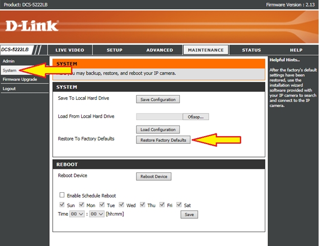 Шаг 6: После обновления прошивки камеру рекомендуется сбросить к заводским настройкам. Для этого в меню слева выберите System (Система) и нажмите кнопку Restore Factory Defaults (Восстановить заводские настройки).