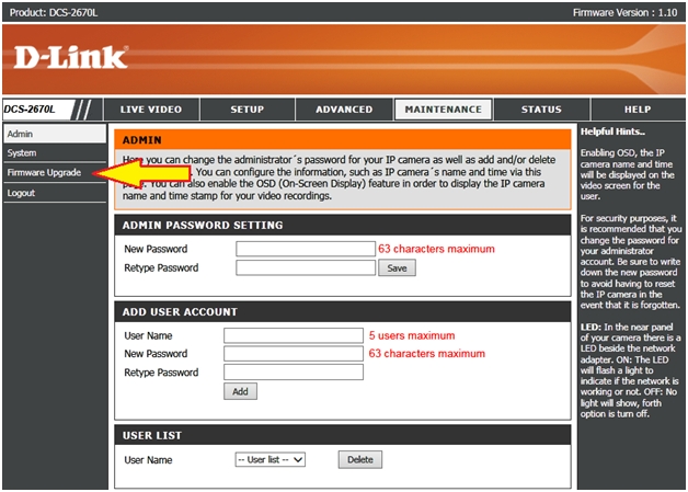Шаг 4: Выберите слева в меню Firmware Upgrade (Обновление прошивки).