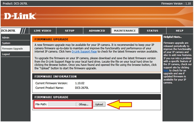 Шаг 5: Нажмите кнопку Обзор и в открывшемся окне выберите файл с прошивкой. Далее нажмите кнопку Upload (Загрузить).