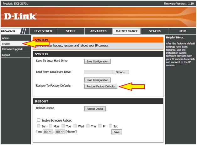 Шаг 6: После обновления прошивки камеру рекомендуется сбросить к заводским настройкам. Для этого в меню слева выберите System (Система) и нажмите кнопку Restore Factory Defaults (Восстановить заводские настройки).