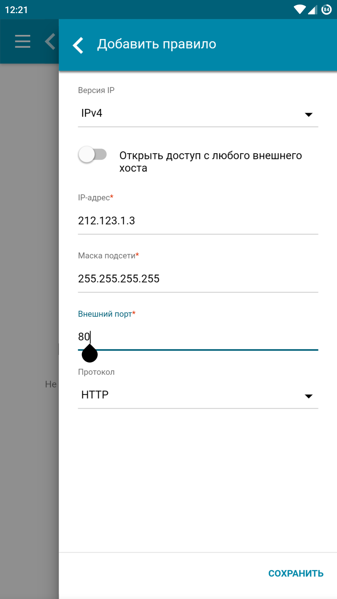 Если вы хотите разрешить доступ с определенного IP-адреса, введите его в соответствующем поле, далее укажите Маску подсети (стандартно 255.255.255.255) и внешний порт, который будет использоваться для доступа (по умолчанию – порт 80).