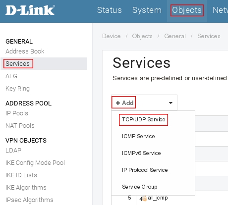 Пройдите в веб интерфейсе Objects → Services, нажмите кнопку add, из выпадающего меню выберите TCP/UDP Service