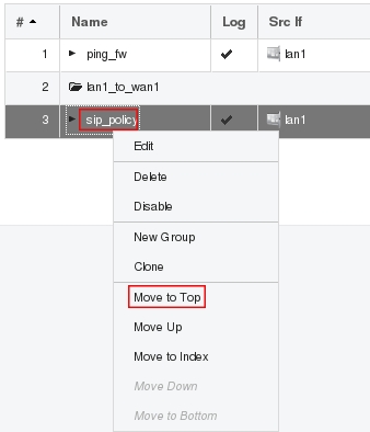 add IPPolicy Name=sip_policy Service=sip SourceInterface=lan1 SourceNetwork=InterfaceAddresses/lan1_net DestinationInterface=wan1 DestinationNetwork=all-nets Index=1 VoIP=Yes VoIP_Policy=sip SourceAddressTranslation=NAT