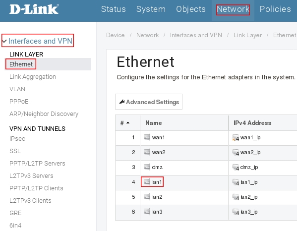 Пример настройки будет выполнен на DFL-870. В качестве примера, будет настроена одинаковая сеть на интерфейсах lan1 и lan2. При настройки следует учитывать, что на интерфейсах должен быть установлен уникальный IP адрес но принадлежащий подсети. Использовать одинаковый IP адрес на разных интерфейсах нельзя.