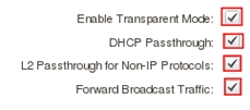Включите следующие опции: Enable Transparent Mode, DHCP Passthrough, L2 Passthrough for Non-IP Protocols, Forward Broadcast Traffic