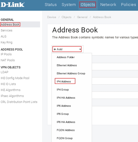 Пройдите в web интерфейсе Objects → Address Book и нажмите кнопку Add, из выпадающего меню выберите IP4 Address.