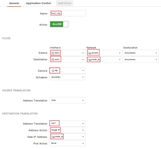 DestinationInterface=wan1 DestinationNetwork=public_ip Service=rdp