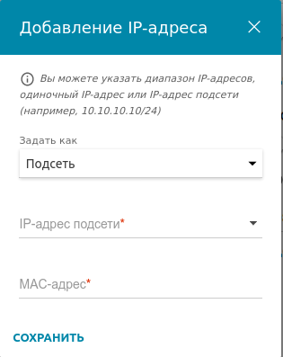 Примечание: в данном случае поле MAC-адрес заполнять не нужно. Это поле является обязательным только тогда, когда не заполнено поле Начальный IP-адрес/ IP-адрес подсети.