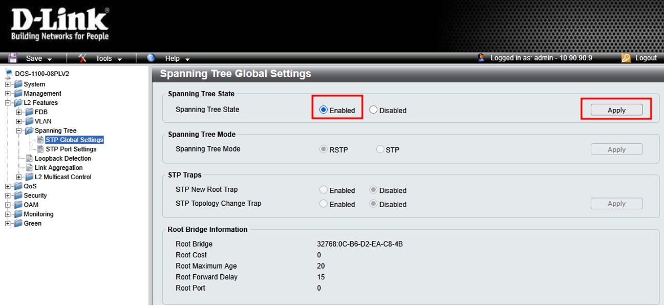 Коммутаторы серии DGS-1100 поддерживают 2 версии протоколов связующего дерева: Spanning Tree Protocol (STP) и Rapid Spanning Tree Protocol (RSTP).
