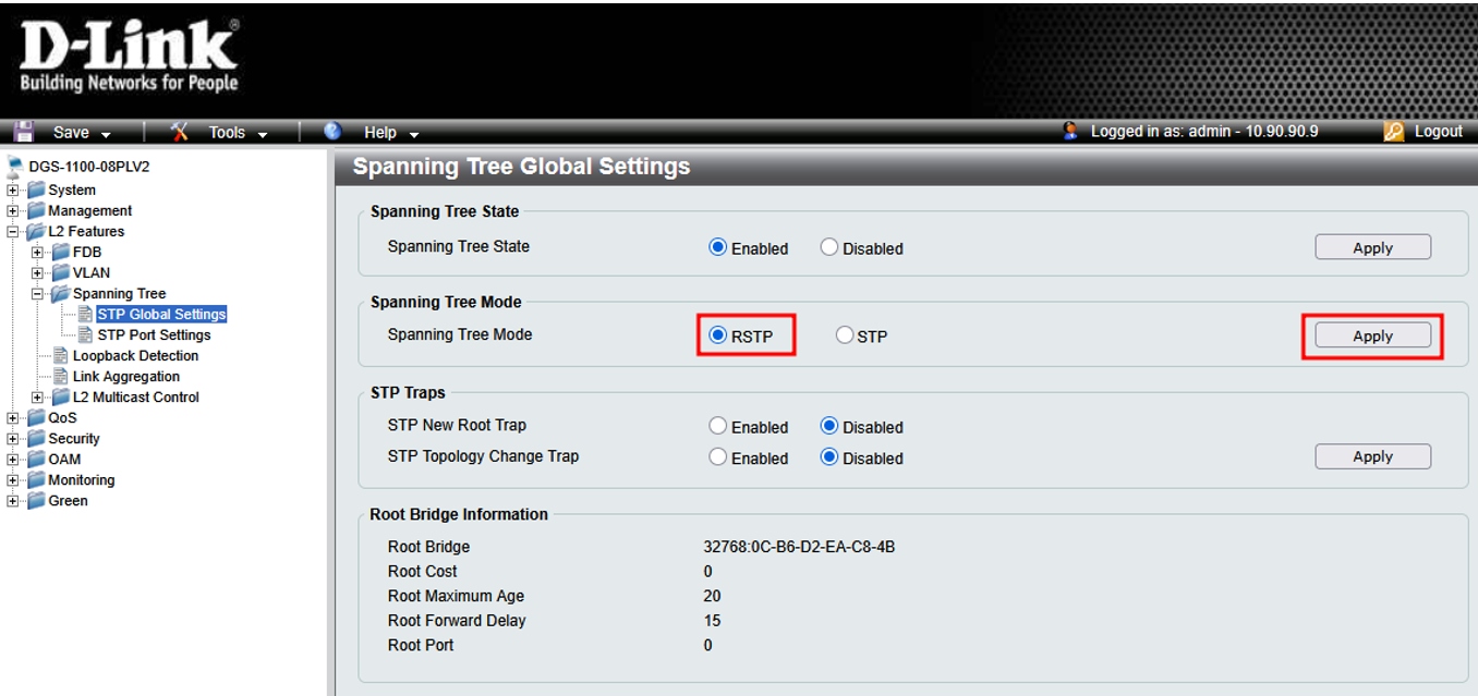 3. Для выбора версии протокола RSTP в разделе Spanning Tree Mode укажите RSTP и нажмите Apply.