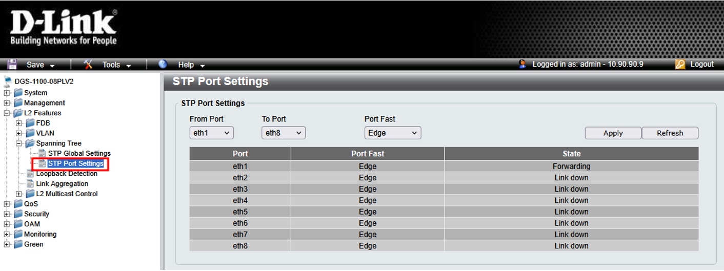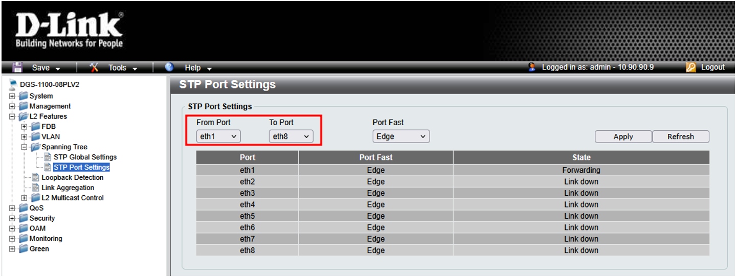 5. Для настройки портов в меню слева выберите L2 Features → Spanning Tree → STP Port Settings и укажите диапазон портов, которые будут включены в группу портов связующего дерева.