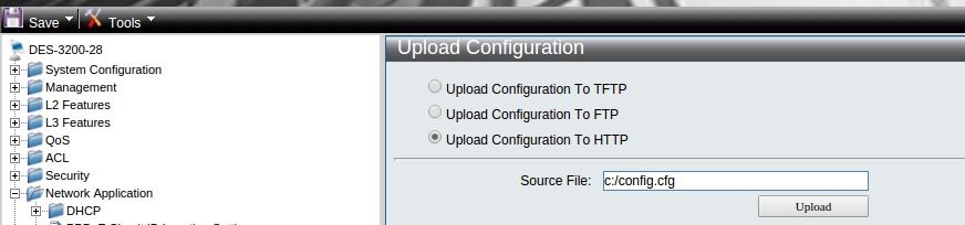 Для того, чтобы выгрузить конфигурационный файл, нужно зайти в раздел Tools - Upload Configuration. Затем нужно выбрать Upload Configuration To HTTP и ввести имя файла источника, который будет выгружен с коммутора(по умолчанию config.cfg). (Рисунок 1)