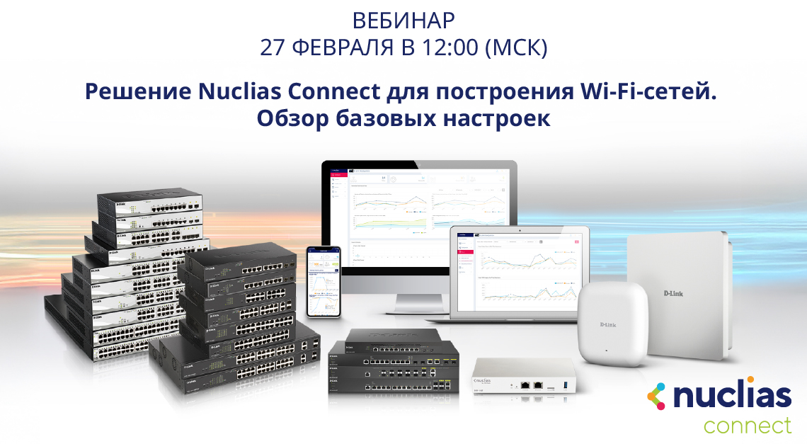 Москва, Россия, 25 февраля 2026 года. Компания D-Link приглашает на вебинар «Решение Nuclias Connect для построения Wi-Fi-сетей. Обзор базовых настроек», который состоится в пятницу, 27 февраля 2026 года, в 12:00 мск.