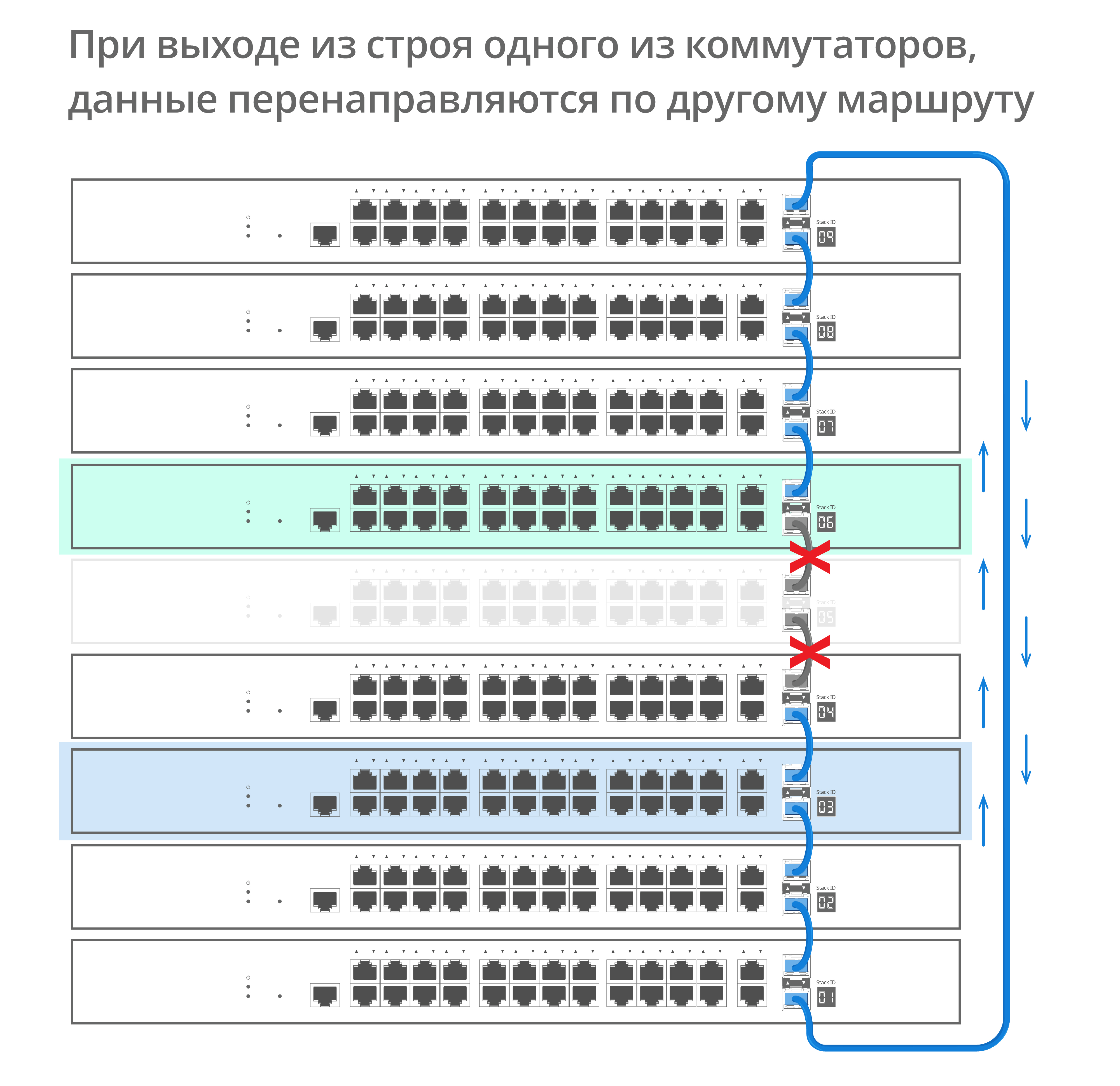 Физическое стекирование объединяет коммутаторы в одно логическое устройство с общими таблицами и единым IP-адресом. Стек по кольцевой топологии обеспечивает передачу данных в двух направлениях. Система автоматически определит оптимальный путь передачи трафика и продолжит работу даже при выходе одного устройства из строя или обрыве связи.